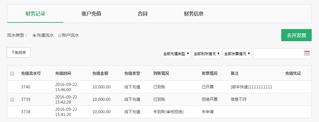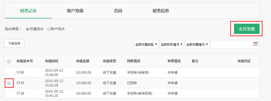 1. 进入“财务记录”页面,在该页面可以看到充值记录,勾选可以开具发票的记录,多次记录可以统一开具在一张发票上。点击“去开发票”,进入“发票开具”的页面